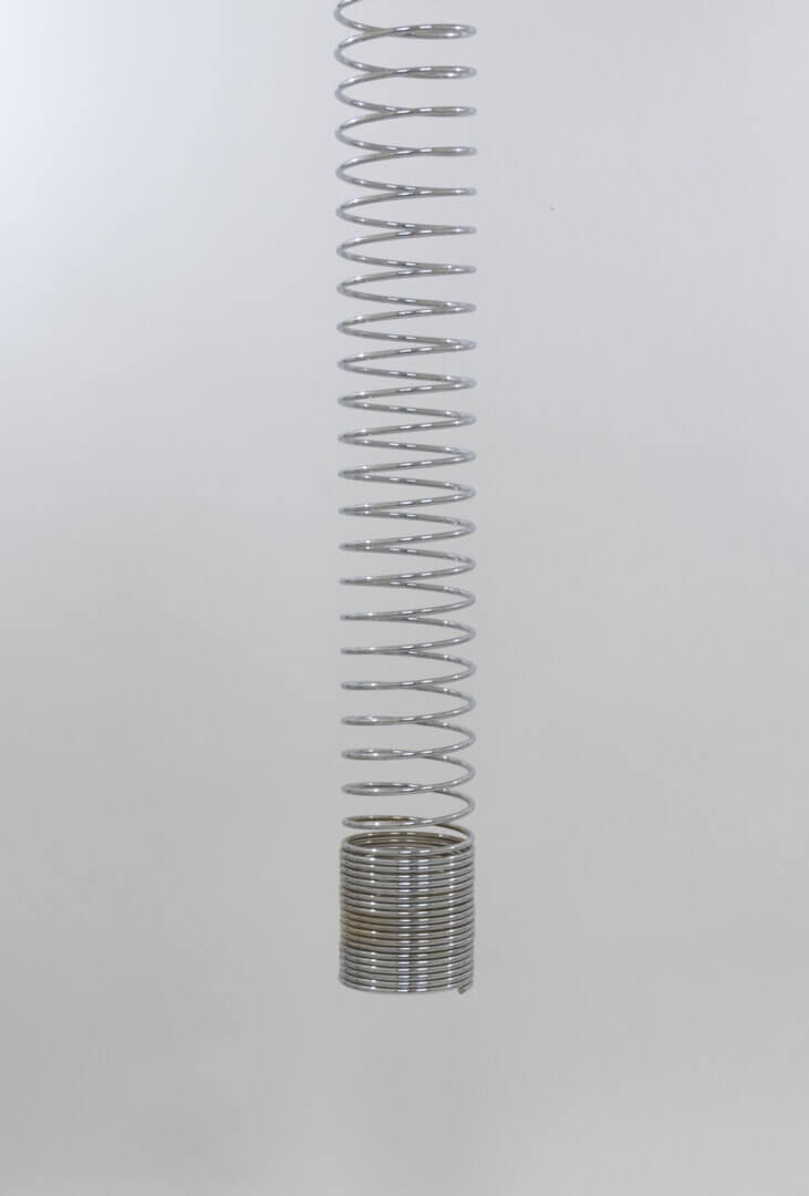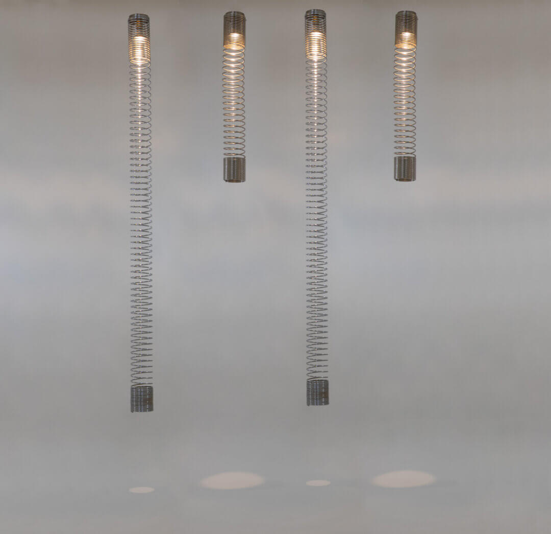 The Spirali ceiling lamps have a chrome-plated steel structure, which is as elastic like a spring, and they are equipped with an E27 fitting at the top of the spiral.