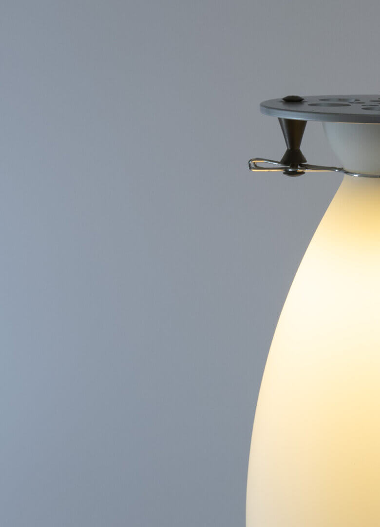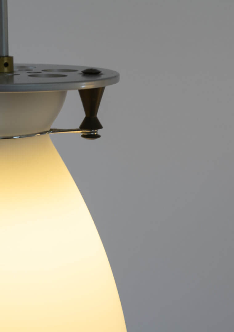 The diffuser is made of satin opal blown glass and the frame is in grey aluminium with details in metal. A flexible spring connects the diffuser to the frame.